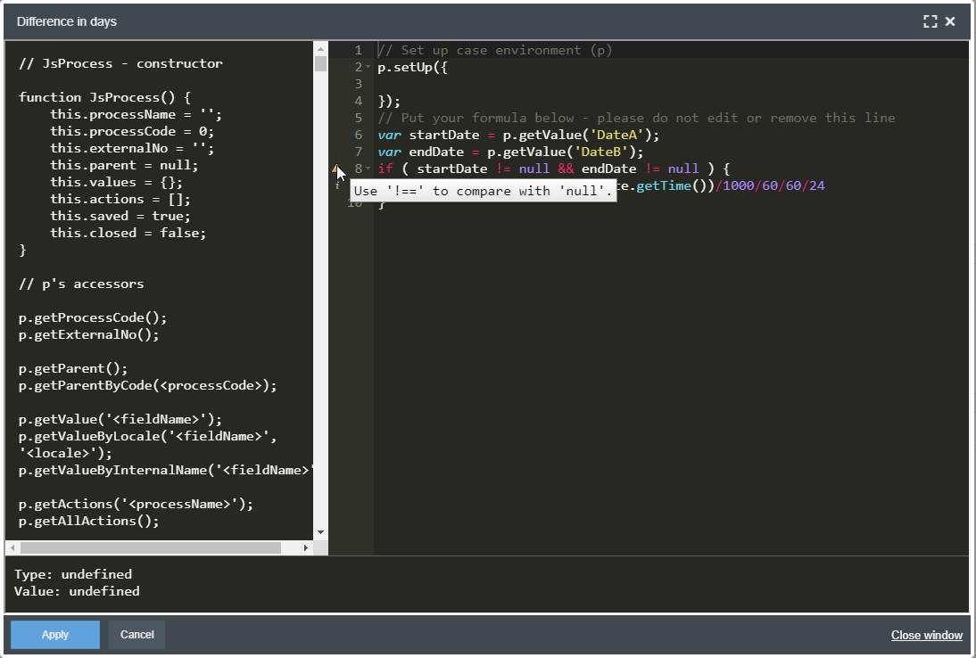 The editor lists the fields and methods that you can use to create the programming code on the left side. For the JavaScript code that you can insert in the middle of the window, the editor will mark syntax errors and other notes for improvement.