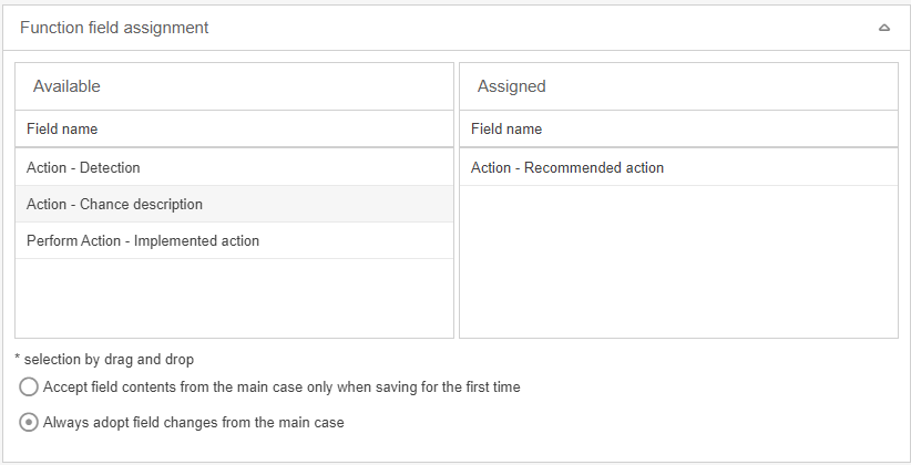 Accept field content from the main case only when saving for the first time | The value of the field from the main form of the parent case is only taken over when the task is created. If the value in the main form is changed afterwards, the value in the task does not change. |