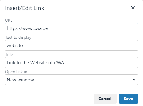With a right click on an inserted image, you can store a link that is called up by the user when he clicks on the image. The options for setting the link correspond to the section " Insert/edit link".