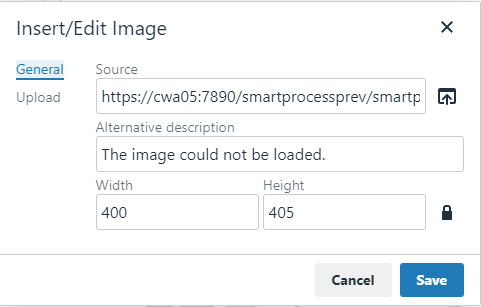 A selection window allows you to insert links to published documents, processes or process groups into the textInsert/edit image