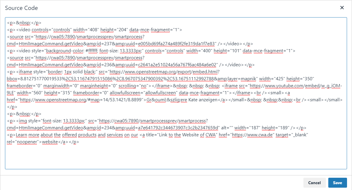 In different areas of SmartProcess, an HTML field is available that allows you to enter formatted text, images, videos, embedded content and links. You can find the field in the following places, for example: