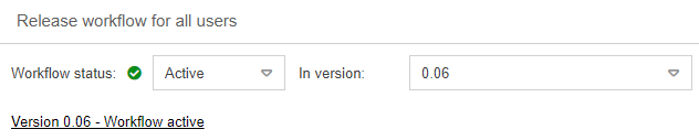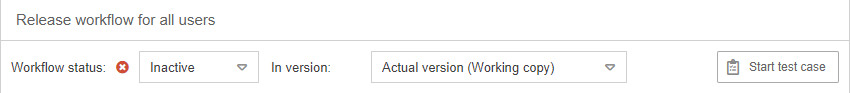 In the "In Version" field, you can set in which version the workflow should be active. The default setting "Actual version (working copy)" refers to the last saved version of the workflow configuration. However, any previously saved version of the workflow can also be activated in the list.