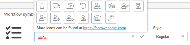 In the second case, the name of the desired icon is entered from the website into the "Symbol selection" field and the style "Solid", "Regular" or "Light" is selected. Clicking on the checkmark confirms the selection.