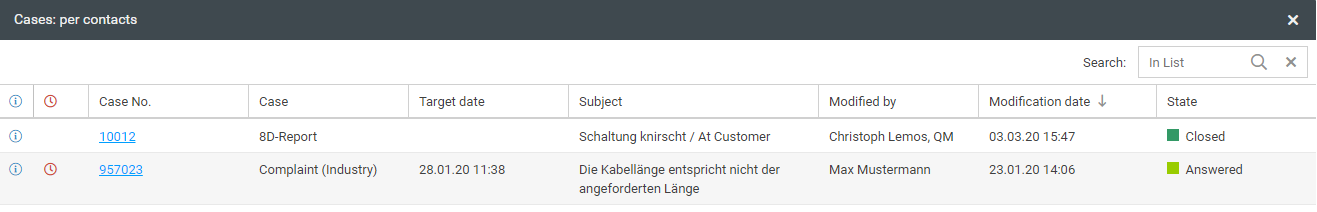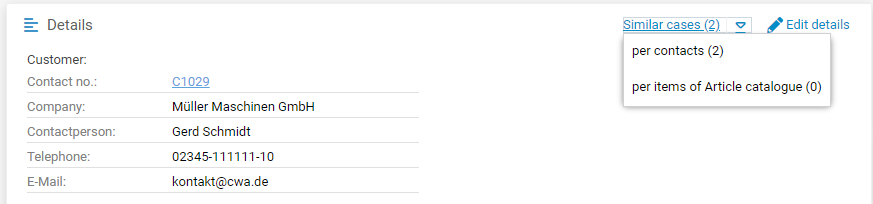 - Example: In a complaint case, the company Müller Maschinen GmbH is selected as the customer. There are already 2 other complaint cases, where also the customer Müller Maschinen GmbH has complained something. So the repetition per contact = 2 is shown in the case window.