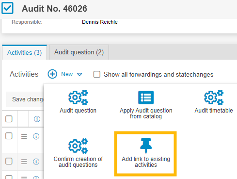 In the activity list of a case, existing activities from other cases can be linked via the <+ New> button. For example, an audit question that has already been assessed and given a finding in an audit #1 can be linked into an audit #2 if the item is also relevant to audit #2.