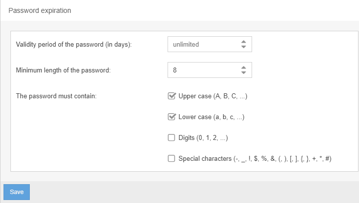 First you can define after how many days a password must be changed by the user. If you leave the field empty, the validity of user passwords never expires.