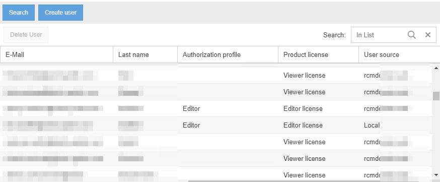 Either filter above the list according to specific properties, such as user name and last name, or use the Search In List to search all displayed columns in the user list for a keyword.