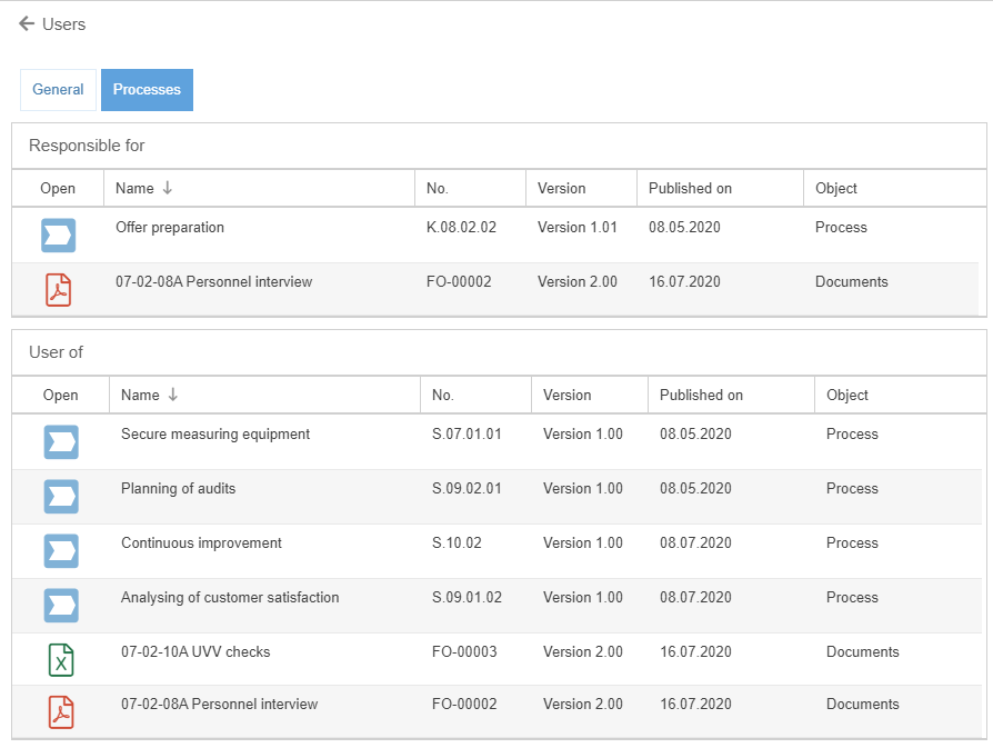 When a user is edited, the Processes and Documents tab is located next to the General tab. This tab lists in 2 separate tables for which processes and documents the user is responsible for or user of.
