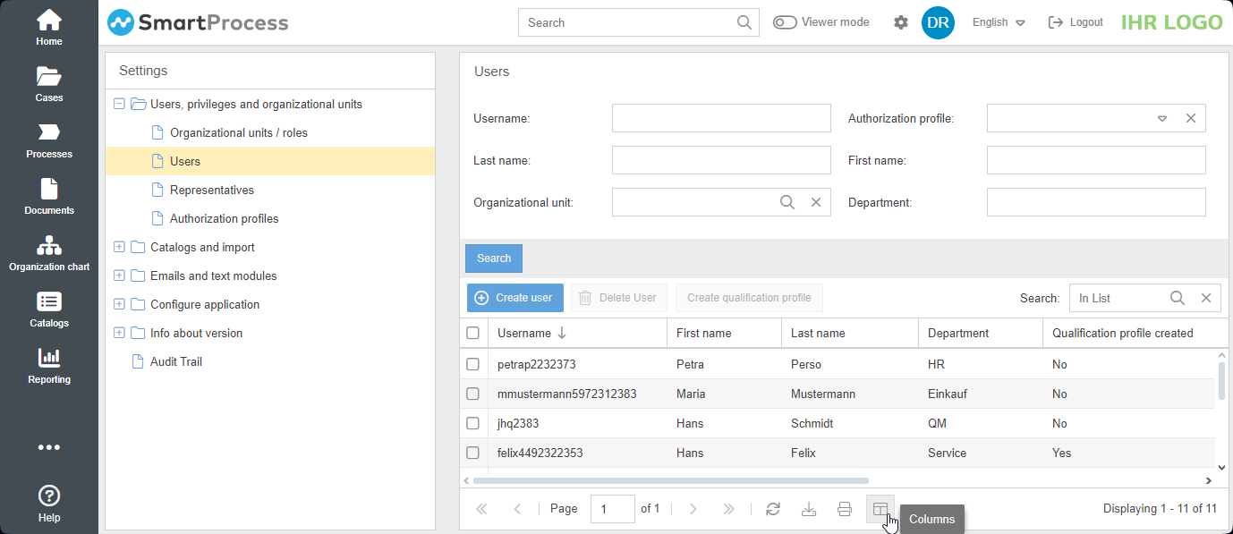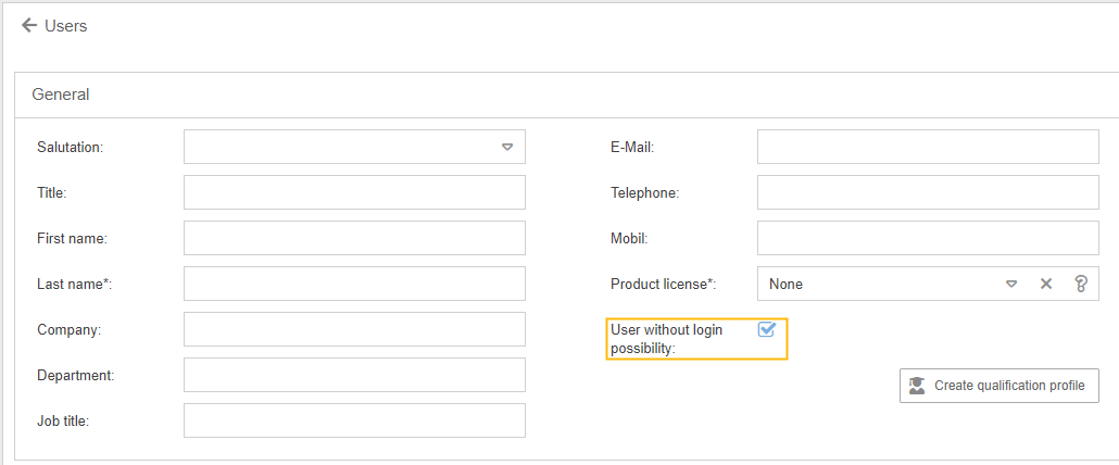 Users without login possibility are only required in connection with the module qualification management. These users have no access to the system, but qualification profiles can be created and managed for them.