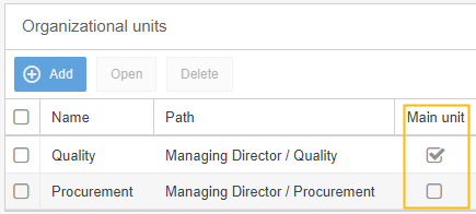 To create and save a new user, an organizational unit must be assigned. To do this, click <Add> and select an organizational unit from the organization chart. If more than one organizational unit is to be assigned to a user, one of them must be selected as the Main unit.