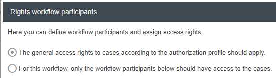 If this is selected, no special access rights apply to the cases of this workflow. Instead, users can access the cases of this workflow according to the general settings of the authorization profile assigned to them. In this case, no further actions are required in this window. | If this is selected, the general authorization profile settings are disabled and accordingly no longer have any significance for this workflow. Only the access rights for the defined workflow participants then apply for access to cases of this workflow. In this case, the workflow participants and their access rights are defined in the following list. The restrictions of an assigned product license are always retained. A user with a viewer license will therefore not suddenly be able to process action cases just because these rights have been assigned to his authorization profile or his role in the workflow participants list. |