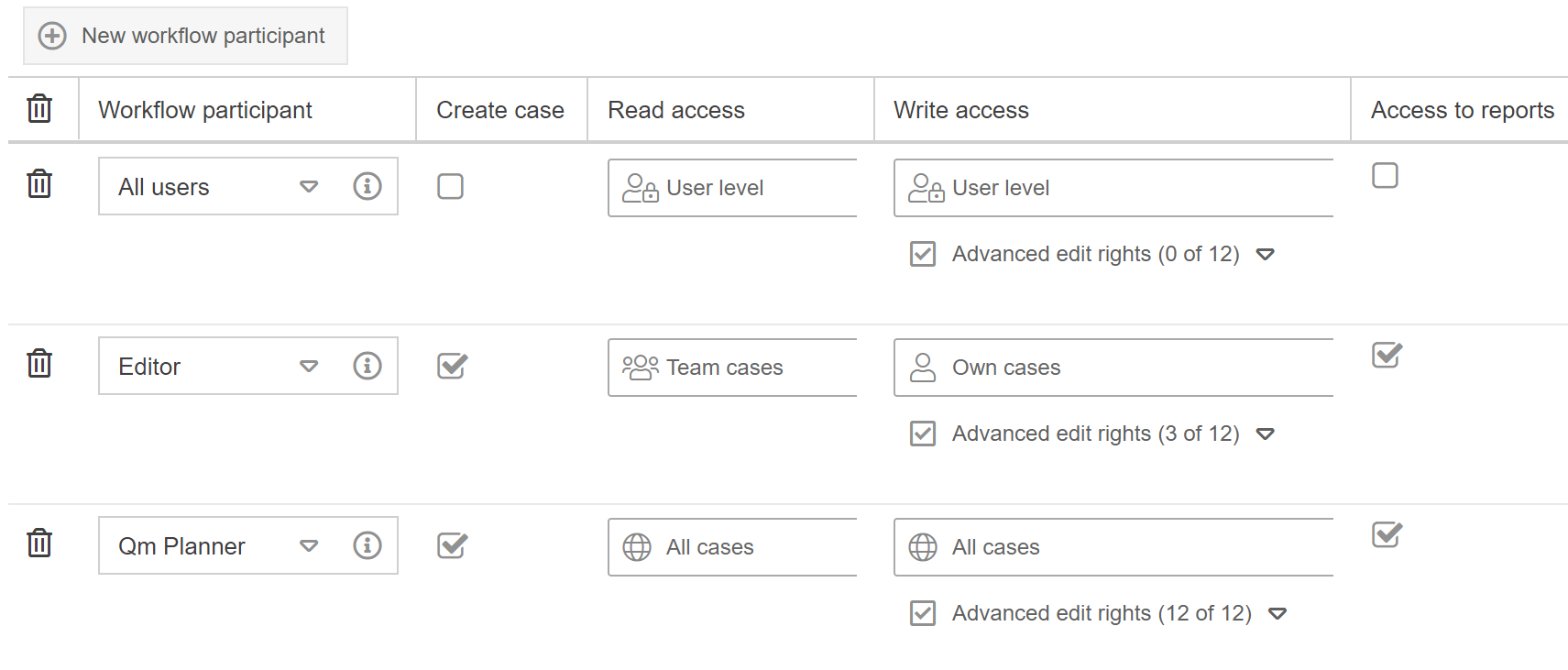![]() x | The selection in the "Write access" column controls which cases of this workflow the workflow participant is allowed to edit. The selection options and their meaning correspond to the general explanations of the authorization profile in the article section Which cases may be edited? The only difference is the option "No cases". With this selection, the workflow participant is not allowed to edit any cases of this workflow. |