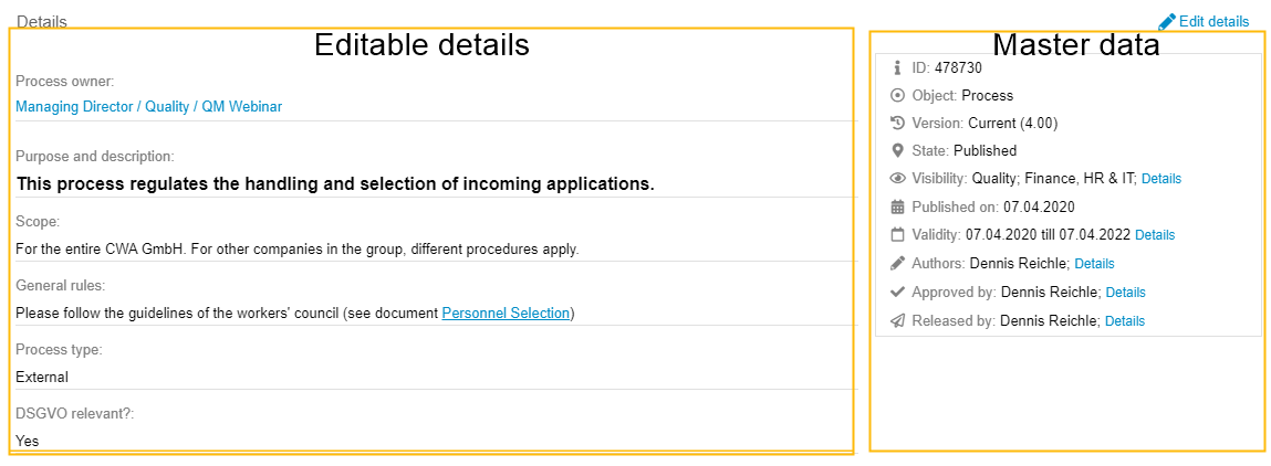 These include the 'Details' window, which is divided into two larger areas. The master data of the process, which is mainly entered automatically, is on the right-hand side and the editable details of the process are on the left-hand side.
