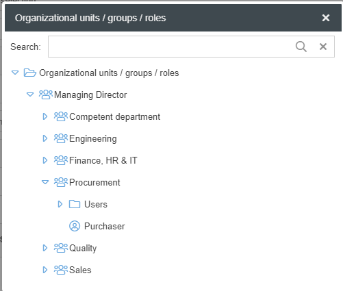 Process owner | The unit responsible for the process can be entered in the Process owner field. With a click on the magnifying glass the organizational chart opens, from which an organizational unit, role or user can be selected. ![]() Selecting an organizational unit or role as the process owner is recommended. If a user is selected, the details of each process for which the user was entered as process owner must be edited when the responsibility changes. The process owner has some special functions (If an organizational unit or role is set as process owner, this applies to all users of this organizational unit/role).