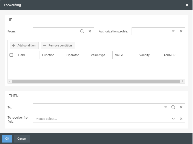 Thus, it can first be checked by whom the process is sent and which authorization profile the user has, and then sent to a specific recipient under a specific condition, which can be configured via <+ Add condition>.