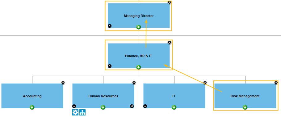 Authorization profile [Name of authorization profile] on same level or upper org. unit | The case is sent to one or all users who have the specified authorization profile and are assigned in the same organizational chart object or on the same horizontal level of the organizational chart or a higher level organizational chart object in the organizational chart as the user who is currently sending the activity. The search in higher organizational units goes in ascending order in the organizational chart until the authorization profile is found. This means not only up to the next higher unit. ![]() |