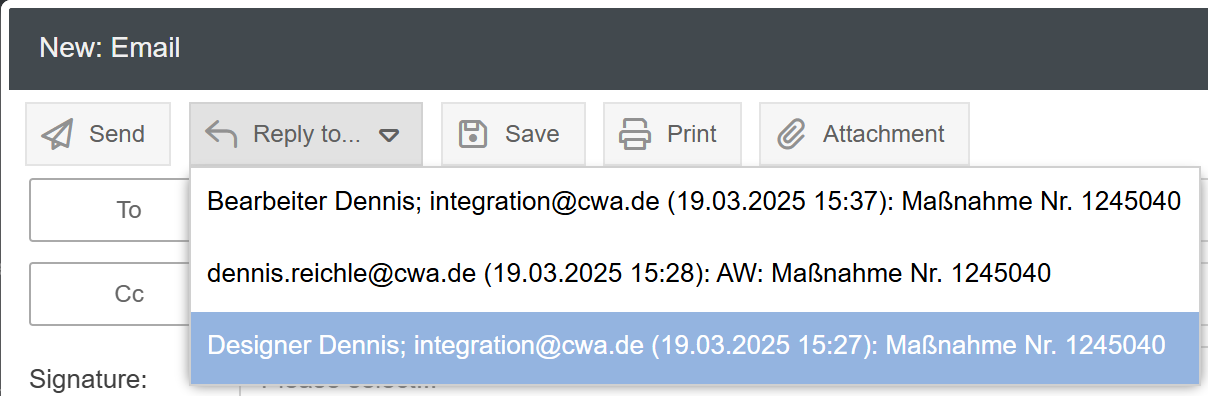 - When composing an email from a case, it is now possible to reply to a previous email in the case using the Reply to... button. The previous message history is then loaded into the text field of the e-mail that is being created.