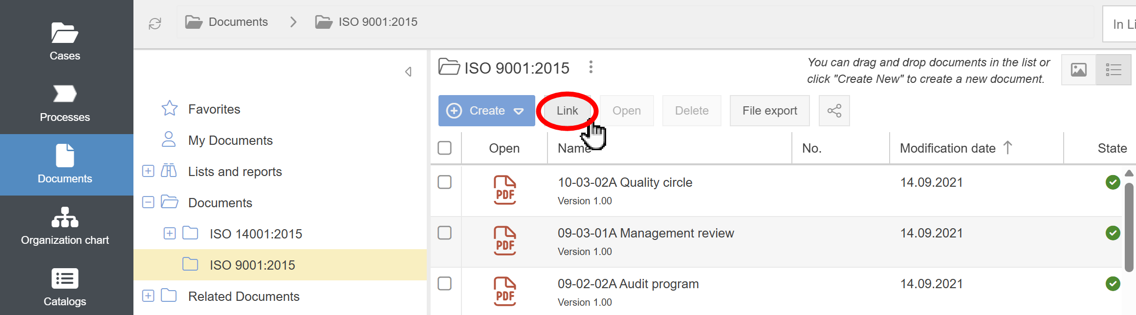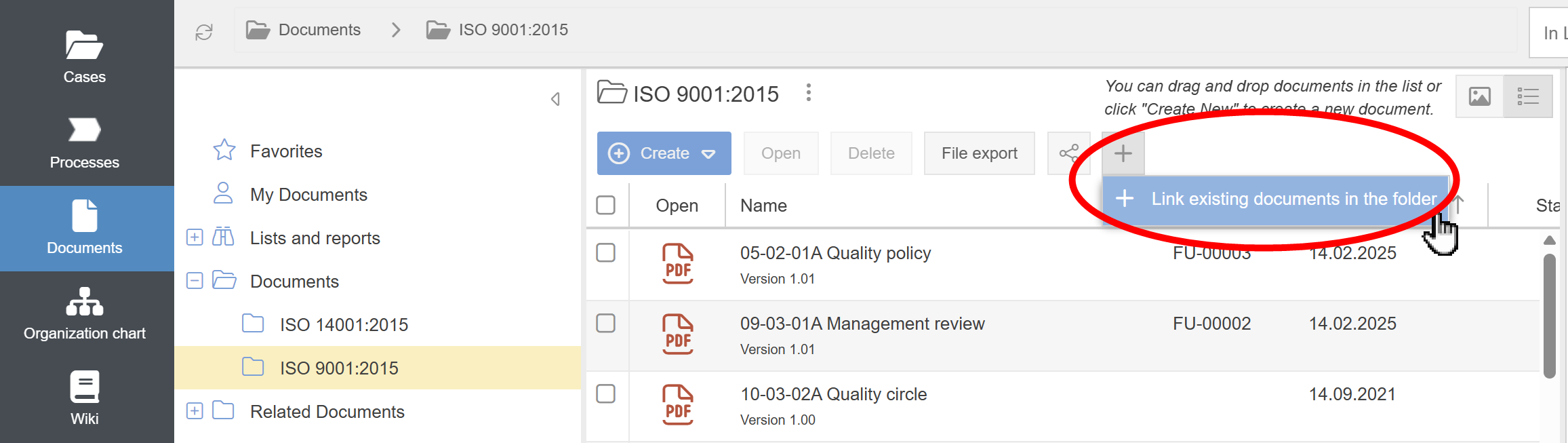 - In the list view of a folder in the Documents menu, the Link button for reusing documents from other storage locations in the currently selected folder has been removed. This function is now available by clicking the + button and afterwards on Link existing documents in the folder.