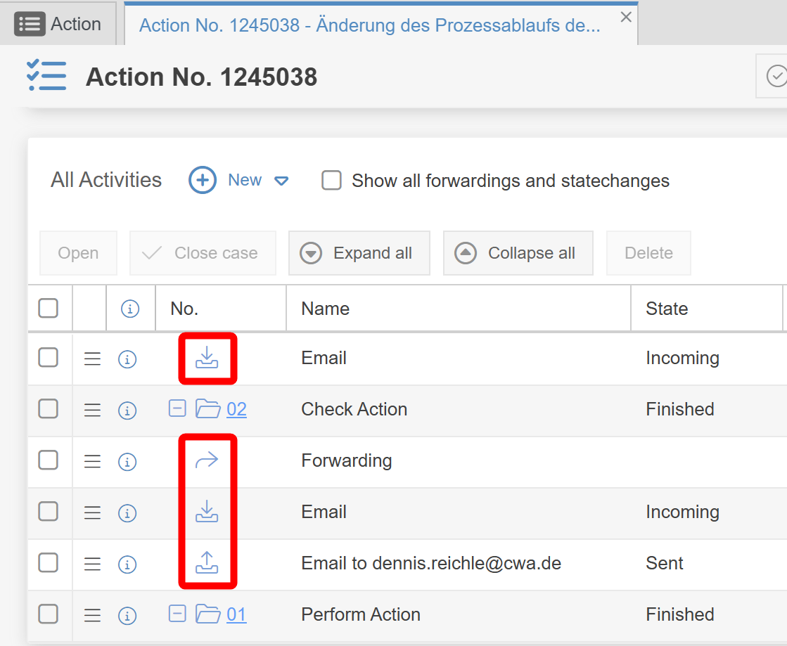 - In the activity list of a case, forwardings with comments as well as incoming and outgoing emails are now highlighted with their own icon in the No. column.