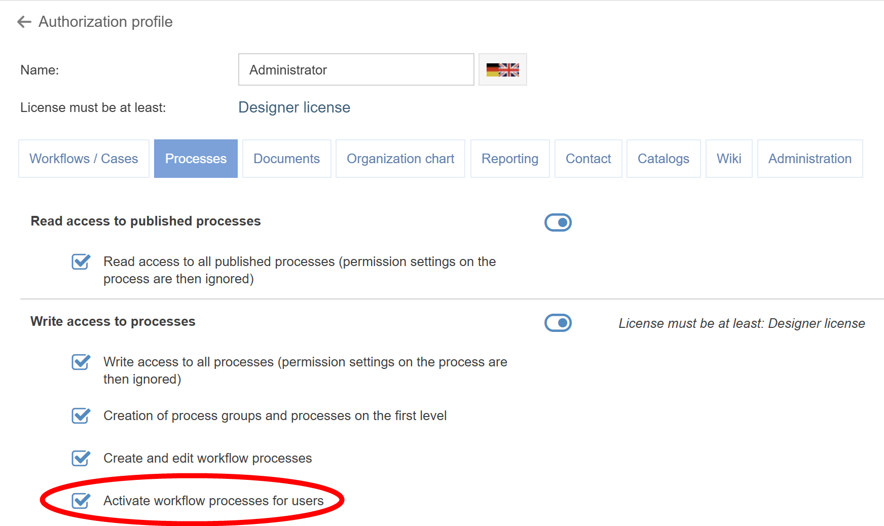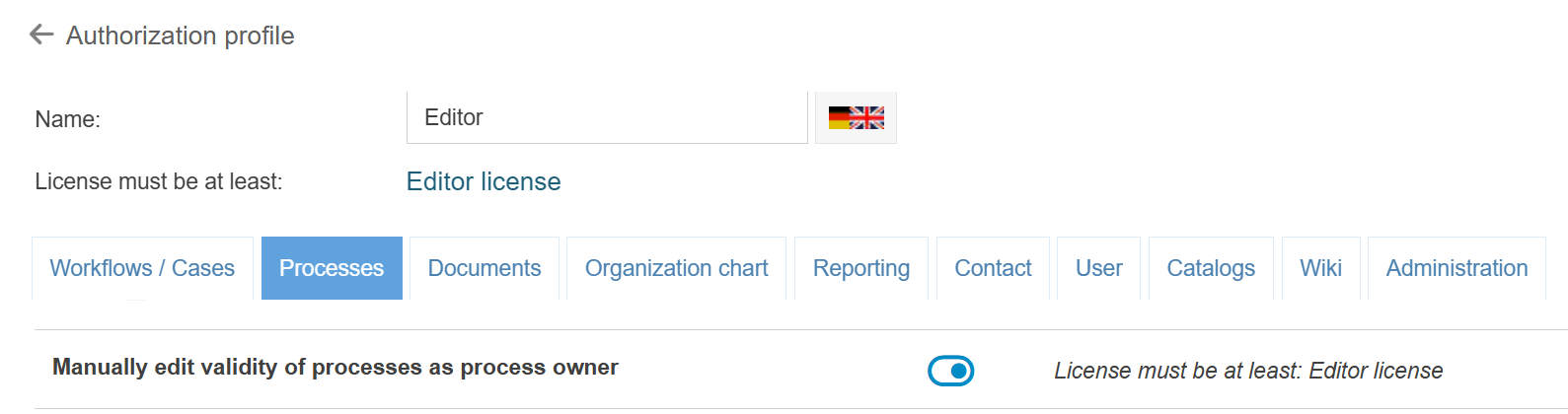 - In the Processes tab of the authorization profile, there is a new privilege Activate workflow processes for users. This is required to activate/deactivate a modeled workflow in the workflow settings for end users or to change the activated version.