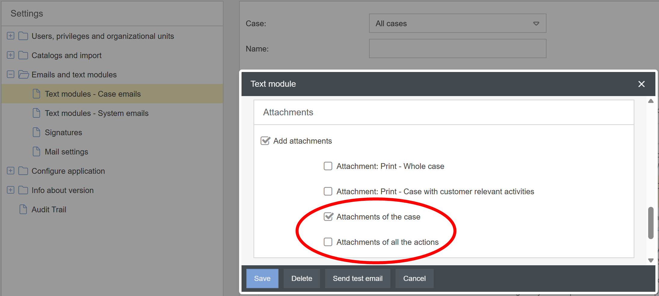 - When configuring text modules for case emails, you can select in the Attachments area that all attachments of the case or the attachments of all the activities of the case should be sent as email enclosures when the email is sent.
