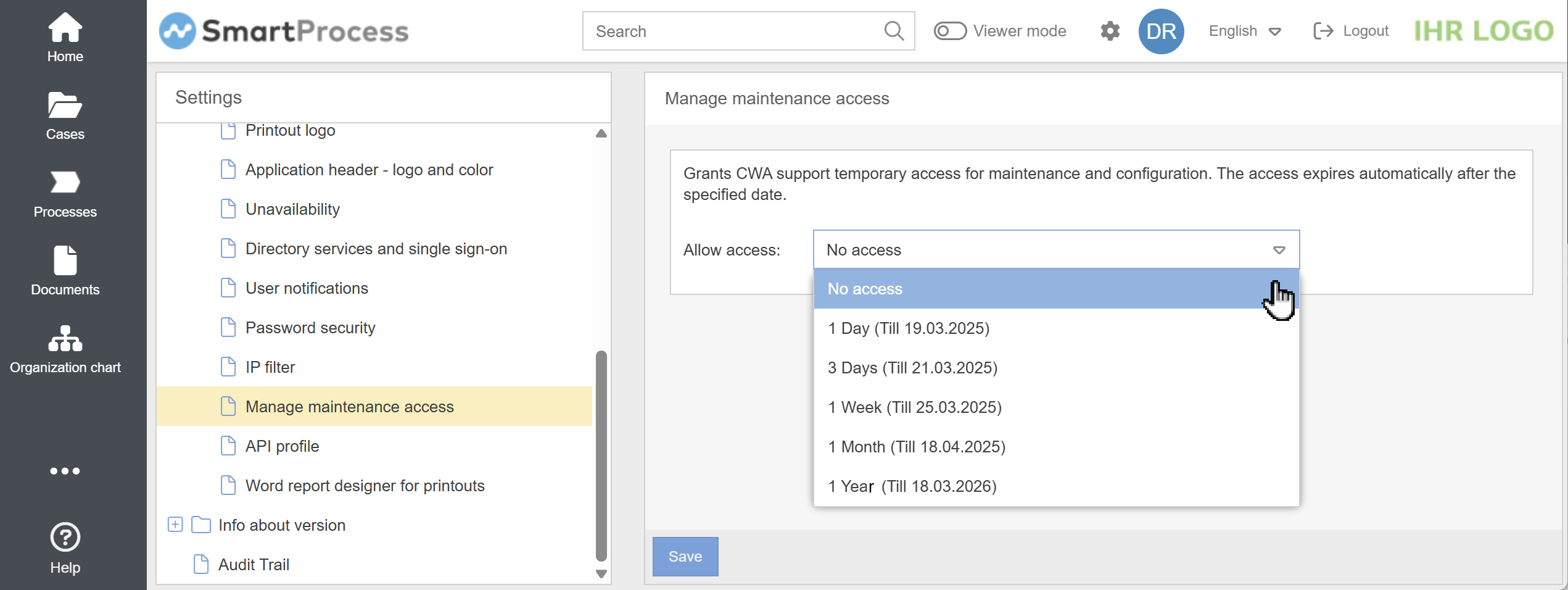 - Management of remote maintenance by CWA for SaaS systems. If you have a SaaS installation of SmartProcess, you can use the new Manage maintenance access setting under Settings -> Configure application to determine whether and within what time frame CWA support staff can access your SmartProcess installation with a maintenance user.