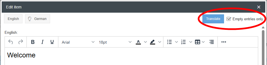 - When using the Automatic translation feature, the new Empty entries only option can be used to decide that the content to be translated is only entered for the languages for which a translation has previously been missing. The checkbox is activated by default. If it is deactivated before clicking on the Translate button, the content in the languages for which a translation has already been maintained is also overwritten during translation.