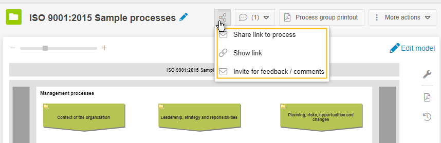 Via the <Share> button a process or a processgroup can be made accessible to others. Thereby you can -Send the link to the process or processgroup by e-mail -Display the link to use it elsewhere -Invite other users to provide feedback and comments