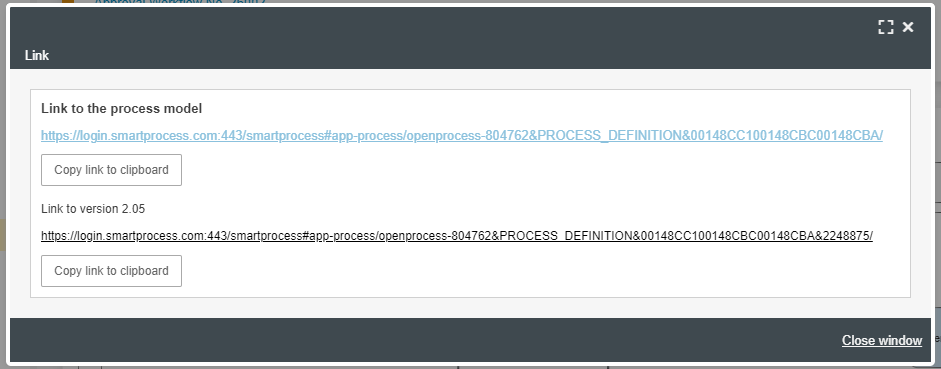 - Link to the process model (dynamic): Based on their permission, users are individually shown the process version they are allowed to see (for viewers usually the last published main version, while designers see the current working version).