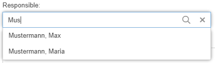 Person | The field is linked to the user administration and in the process the user list opens, from which a user can be entered into the form. In the form, this field can also be used later as a search field. If a name is entered, value suggestions are automatically displayed. ![]() A free input of a name can therefore no longer be made. This function is often used to flexibly determine a recipient for forwarding an operation using the "Forward case" object. |