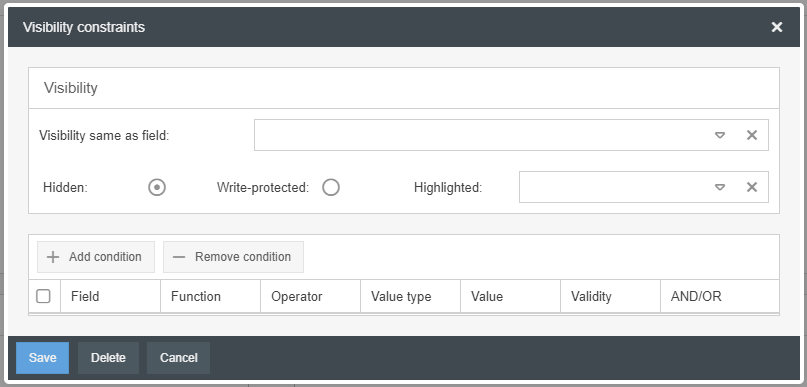 With the button <Edit> you can define visibility restrictions for the field. In this way, the field can be hidden or grayed out (Write protected) or highlighted under freely definable conditions.