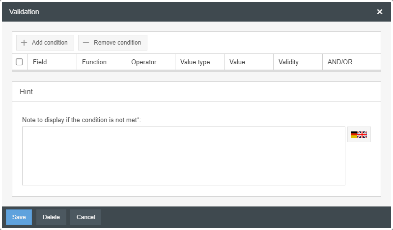 In addition, a hint text must be formulated that will appear if the condition is not fulfilled at the time of the save attempt.