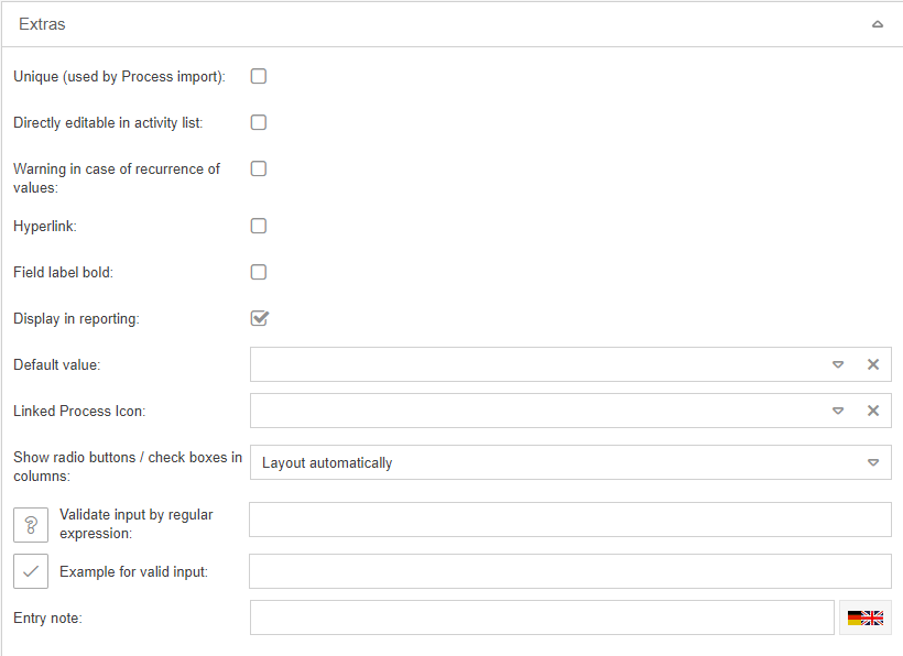 Unique (used by Process import) | Tasks can also be imported by an import. If a field is defined as unique for import, the system checks during the import whether the value to be imported for this field already exists in an existing operation. If the field value already exists, the value is not imported. |
