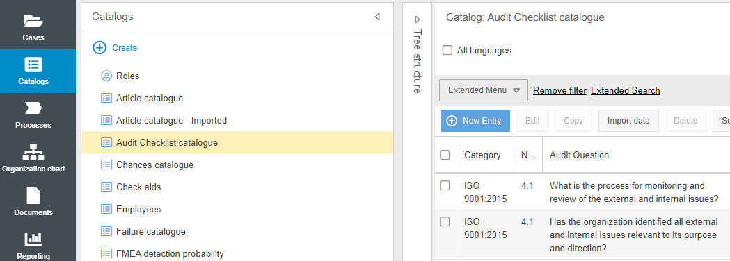 A tree structure can be generated for a catalog in the configuration. This is displayed when a catalog is called up for data processing. In the tree structure, folders and subfolders can be created by right-clicking, which can be used to divide the individual entries into categories.