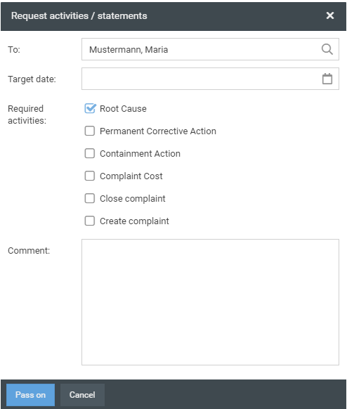 ![]() Via the button <Request activities / statements> you can request an activity from another organizational unit or another user. ![]() After you have selected a recipient via the "To" field, you will be presented with a selection of activities that may be created by the recipient. You can use the checkboxes in the "Required activities" section to select which activities you want to forward to the recipient or 'request' from him/her. |