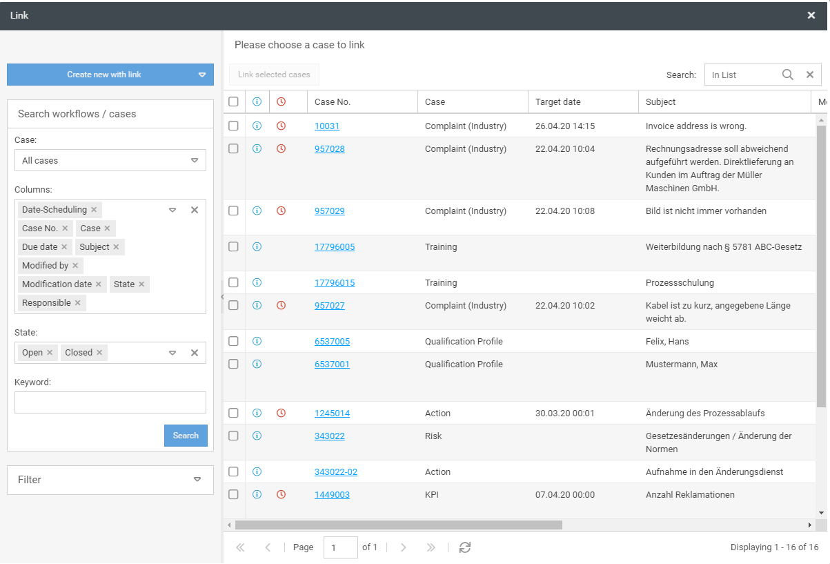 ![]() With the button <Link / Create new> you can link the task with already existing tasks. It is also possible to create new cases to which a link is created. ![]() |
