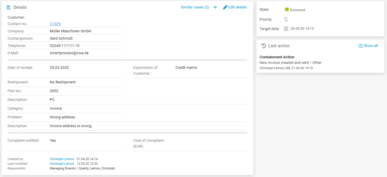 At the bottom of the details window, you can see who created the case, when it was created and who last changed it. Most importantly, it shows who is currently responsible for the case.