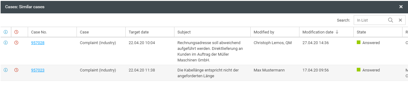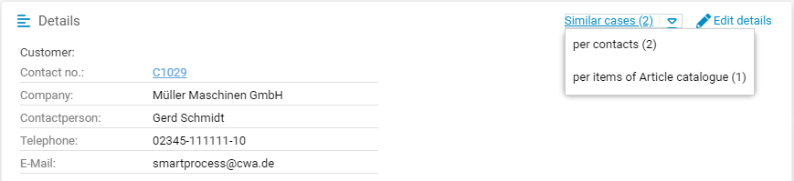 If it has been activated in the workflow settings that similar cases should be displayed, this hint is displayed next to the button <Edit details>.