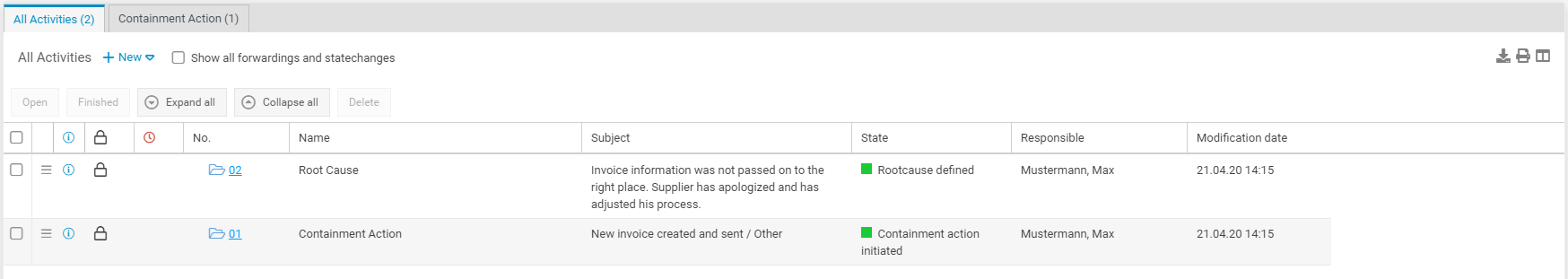 The list can be divided into tabs per activity, provided this has been defined in the form designer.