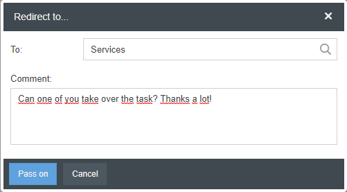 ![]() ![]() ![]() | With the button <Redirect to...> the case can be forwarded to a user or an organization chart object. The forwarding can be extended by a comment for the recipient of the case. ![]() Depending on the authorization profile, a case may only be forwarded to users who are assigned to the same organizational chart object. If the button is displayed as a selection list, the process can be sent back to the last editor. |