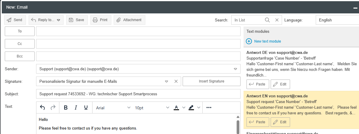 ![]() | With the button <Message to> e-mails can be sent out of the process. On the right side you find preconfigured text blocks that can be defined in the settings under Text modules - Case e-mails. In addition, signatures can be defined in the administration, which can be selected in the drop-down field Signature in this window and added to the e-mail text. ![]() The <To>, <Cc> and <Bcc> buttons to the left of the recipient fields open the contacts directory, which can also be used to call up the internal users. Alternatively, one or more e-mail addresses separated by a semicolon can be entered manually. Click on With the button <Attachment> one or more attachments can be added to the e-mail. E-mails sent from the case are stored in the activity list of the case. |