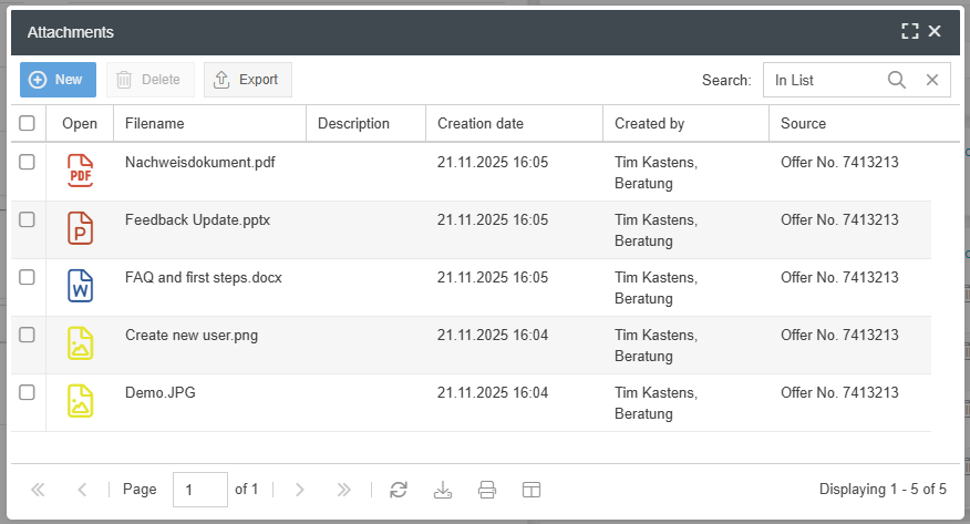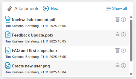 With the button <+ New> or in general via drag and drop in the case window new documents can be added and attachments can be deleted again with the trash can icon.