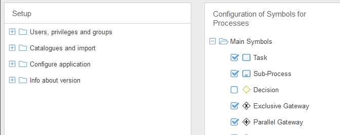 Here you can define which symbols in the process model are available for modeling. The selected symbols are available in the process model.