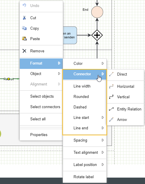 With a right click on the modelled connector the formatting of the standard connectors can be changed in the 'Format' area.