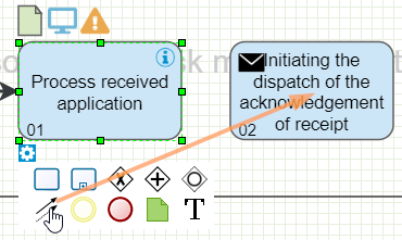 New connector via mini icon palette | Select the object from which the connector is to be dragged by mouse click so that it is highlighted and the mini icon palette is displayed. From the mini palette, drag and drop the symbol for the connector to the center of the object to be connected and release the mouse when the object is displayed with a green frame. ![]() ![]() When the connector is modeled in this way, the connector's start and end points change automatically, if necessary, when one of the connected objects is moved. |