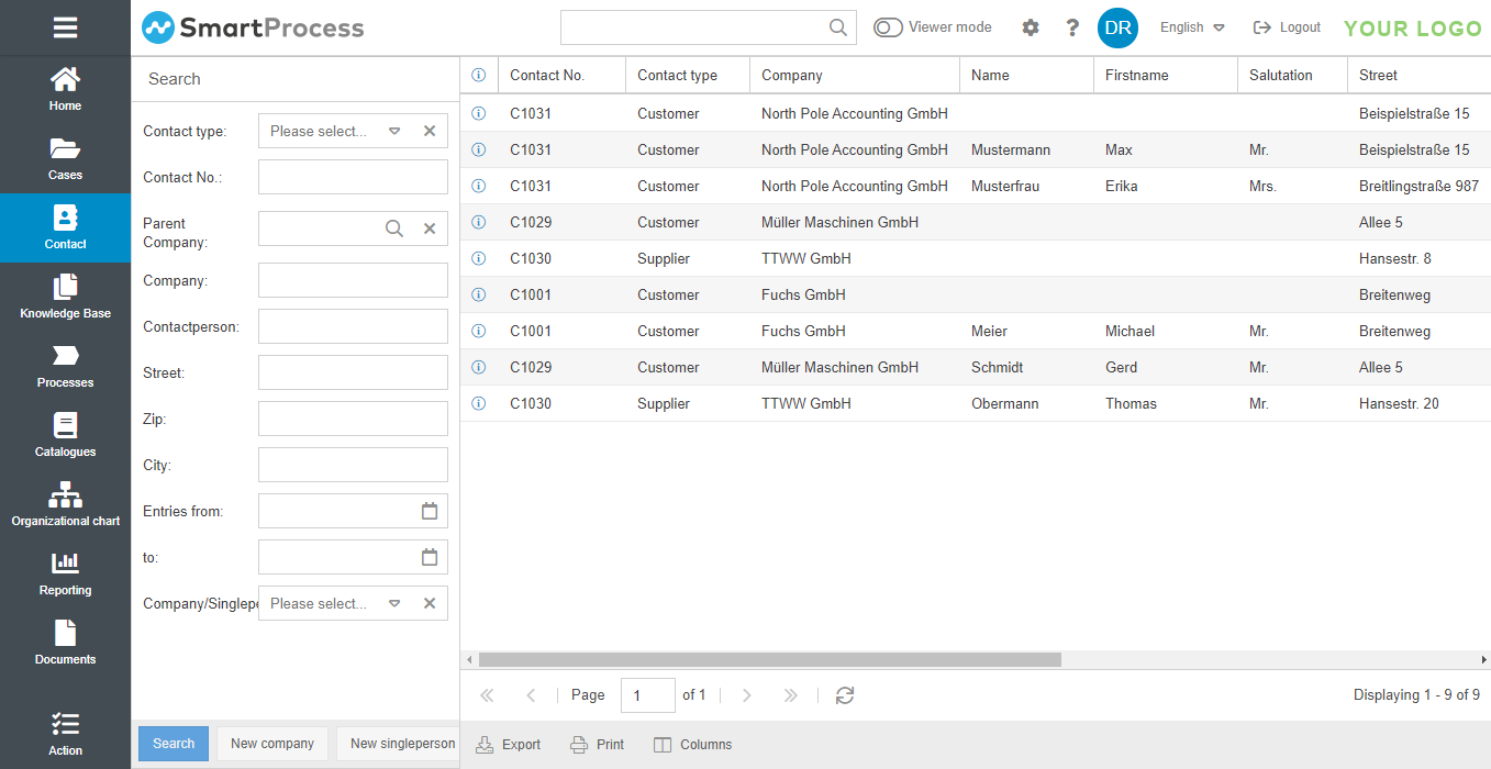 In the Contacts menu, you can store the contact data of your customers, suppliers and other business partners or stakeholders. You can also use the contacts you have entered during case processing.