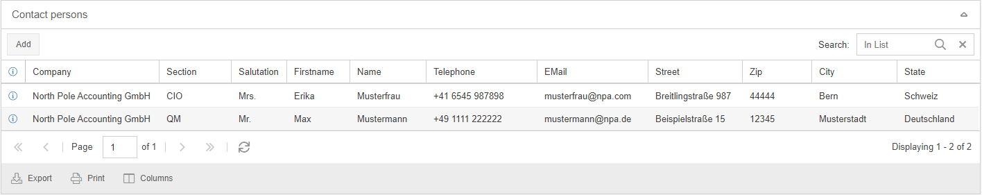 In the editing window of a company contact, all contact persons of that company can be managed in the "Contact persons" area. A new contact person can be added via the button <Add>.