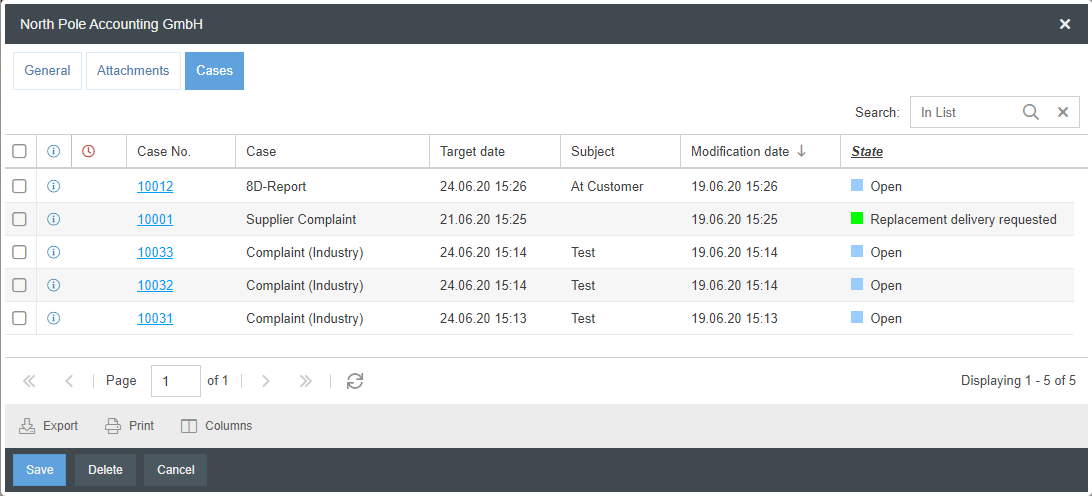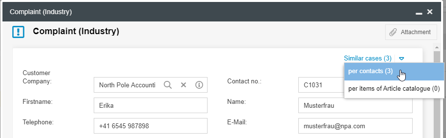 The example shows that the system already contains 3 complaint cases in which the company North Pole Accounting GmbH was also entered as the contact. Click on <per contacts> to display the previous customer complaints for this company.