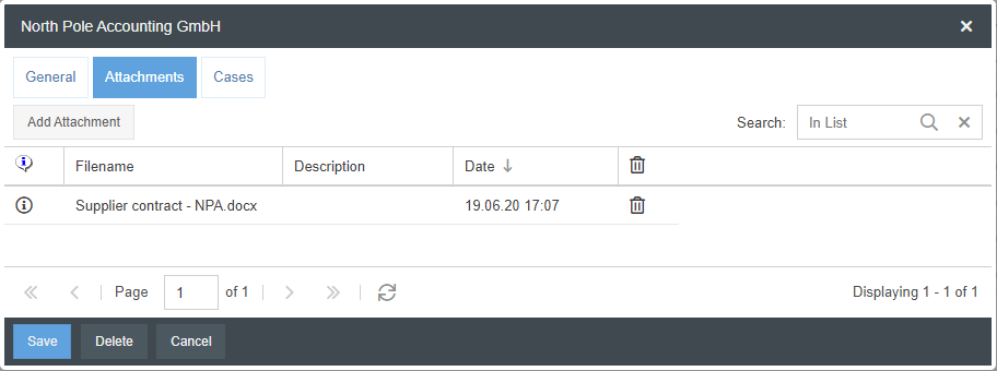 In the Attachments tab, various documents related to the customer / supplier can be added, such as contractual agreements. The following options are available: