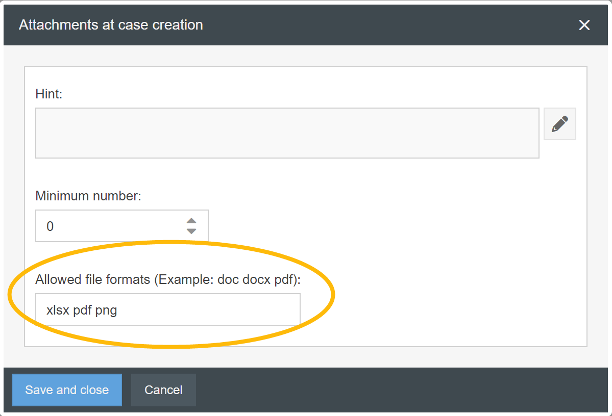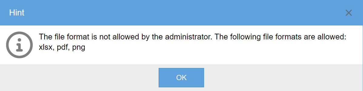 In the following window, you can enter the allowed file formats, separated by a blank space. In the example from the screenshot, the user may only upload attachments with the file format .xlsx, .pdf or .png when filling out the form.